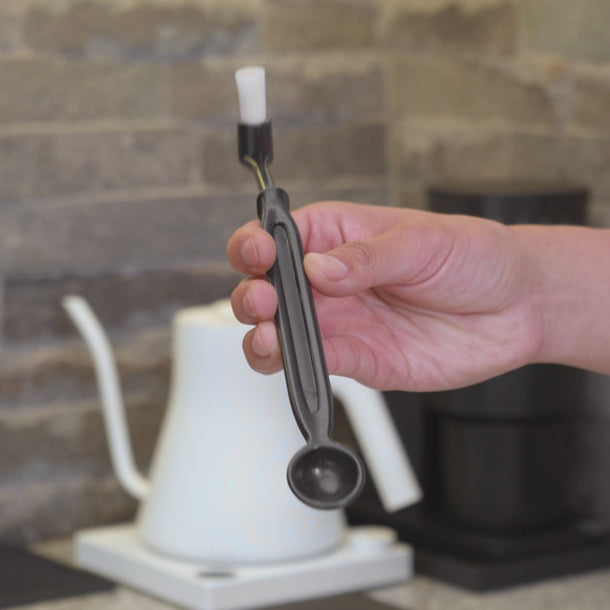 - Diseño 2 en 1: Incluye una pequeña cuchara en el extremo opuesto para dosificar detergente limpiador de cafeteras.