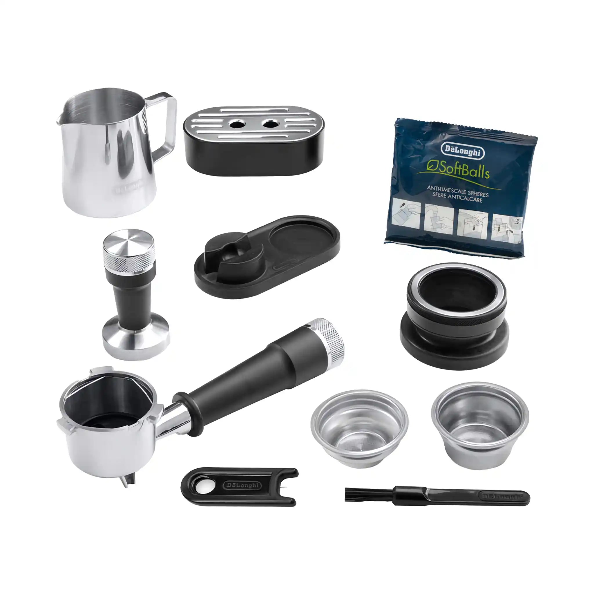 *Incluye tamper, jarra de acero inoxidable, portafiltro, 2 filtros de café, base para el tamper, herramienta multiusos, cepillo de limpieza y bandeja de goteo.