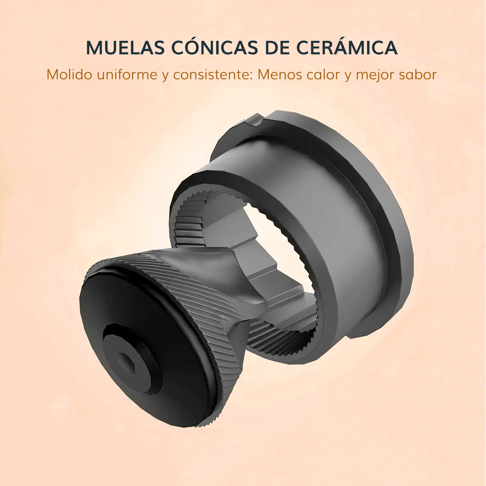 - Muelas cónicas de cerámica: Su sistema de muelas de precisión garantiza una molienda uniforme y constante, preservando el aroma natural del grano