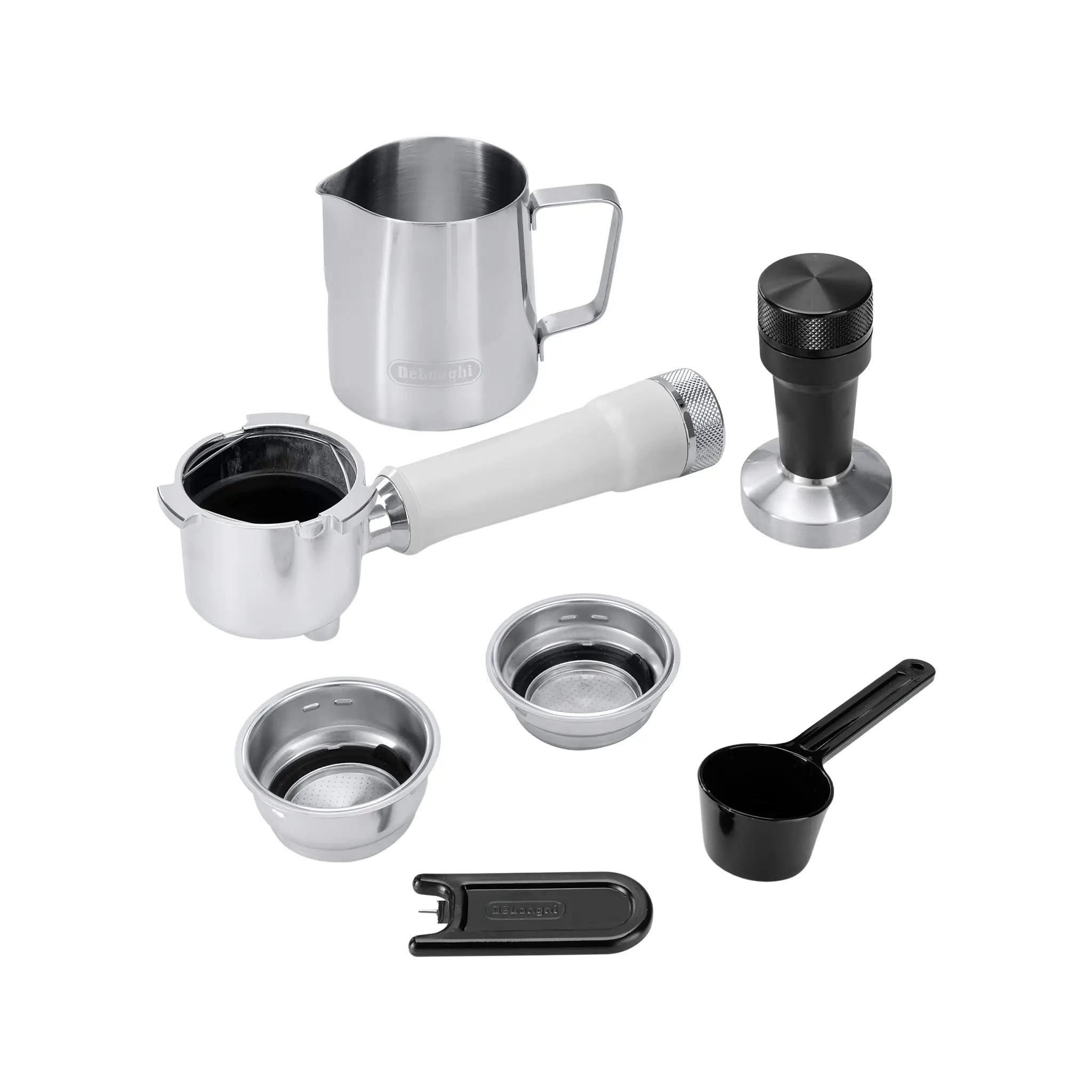 Tamper, portafiltro y 2 filtros presurizados (simple y doble)