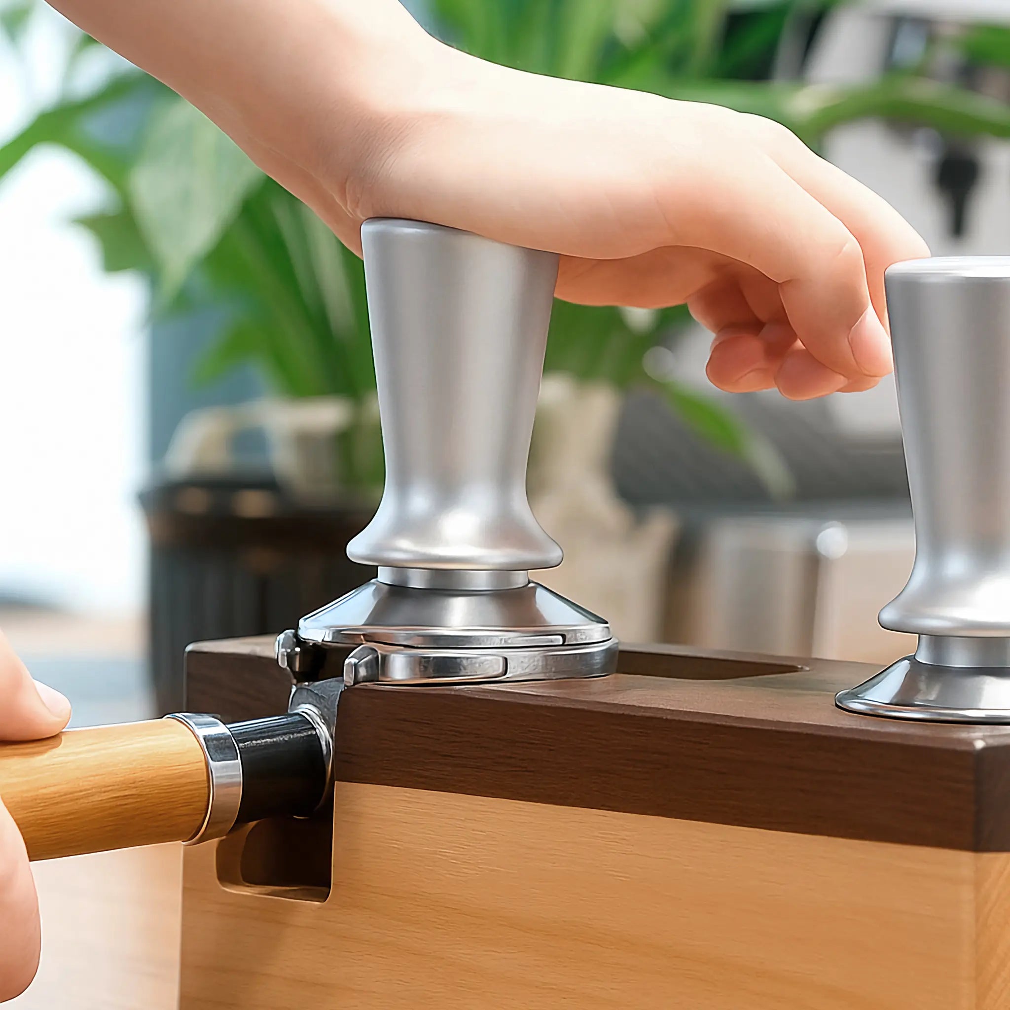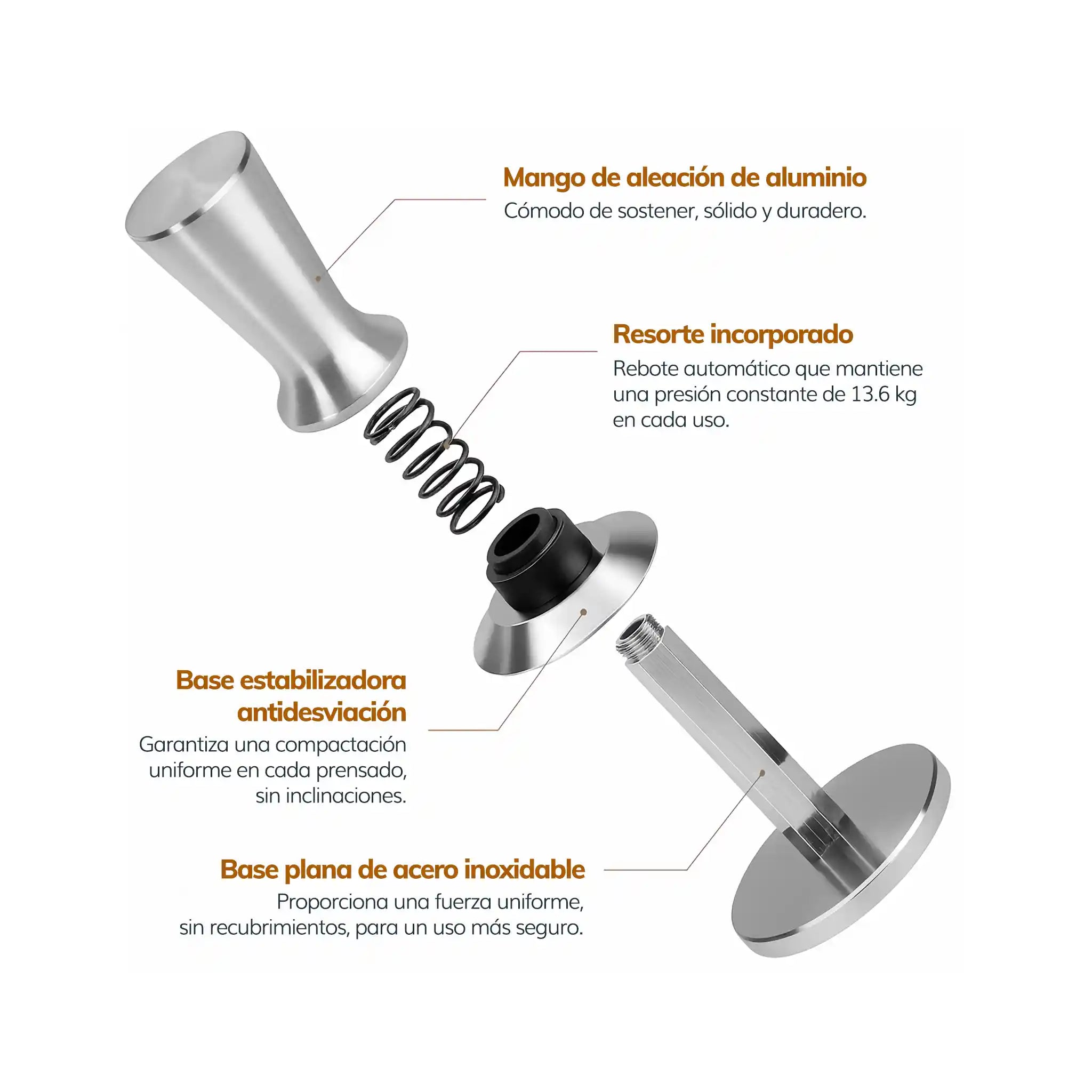 Logra una presión uniforme y profesional con este Tamper Retráctil . Diseñado con un sistema de resorte interno, aplica la presión exacta sobre el café molido en el portafiltro, garantizando una extracción balanceada y constante. Ideal para baristas que buscan precisión y consistencia en cada espresso.